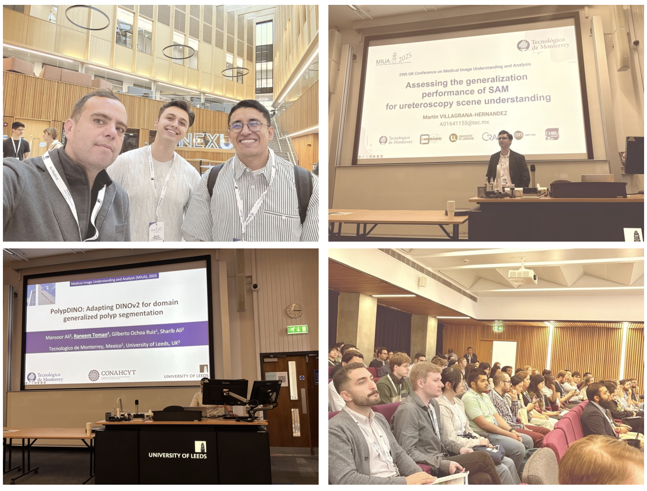 July 15th-17th, 2025,Leeds, United Kingdom: This week myself and two CV-inside lab students are in Leeds attending the UK Conf. on Medical Imaging Understanding and Analysis (MIUA 25)! Martin Villagrana, a bachelonr on biomedical engineering who did a 6 month intership in our labd also attended. This event was an excellent opportunity to network with the vibrant AI community here and look for new collaboration opportunities for our university 😃 We even had a small group of Mexican students
